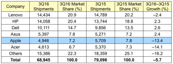 而前五名的PC出货量,Gartner数据显示苹果要排在华硕后面,仅为第五名。在全球六大PC制造商当中,有一半厂商(联想、苹果和宏碁)的出货量在第三季度出现了下滑。