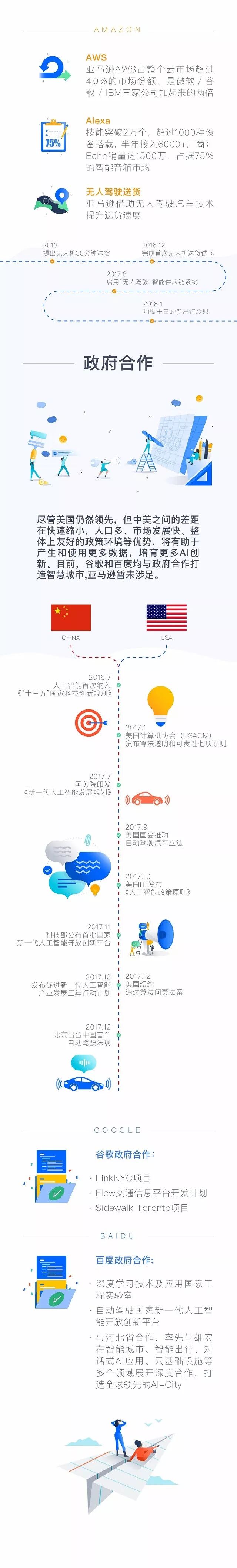 好在有百度在两三年前就开始进军AI,这才使得中国在AI领域有了争夺世界领先位置的可能性,目前看这个位置中国还是有实力争一争的,相关的产业政策与产业措施也密集发布。2017年2月,国家委托由百度牵头筹建深度学习技术及应用国家工程实验室;2017年11月,科技部宣布依托百度公司建设自动驾驶国家新一代人工智能开放创新平台;2017年12月,百度与河北雄安新区管委会签署战略合作协议,推动河北省智能城市(AI-City)整体建设,将雄安新区打造成为全球智能城市新标杆。Apollo将助力雄安新区,打造全球领先的智能出行城市。