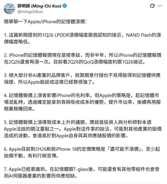 郭明錤预测iPhone 18定价策略:苹果宁愿牺牲硬件利润,也要“圈住”你