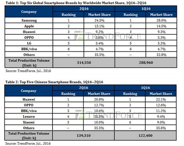 国外调研机构TrendForce刚刚公布了2016年第二季度全球以及国内市场智能手机出货量与占有率报告。苹果三星包揽前两名,国货华为、OPPO、LG和vivo排在世界前列。